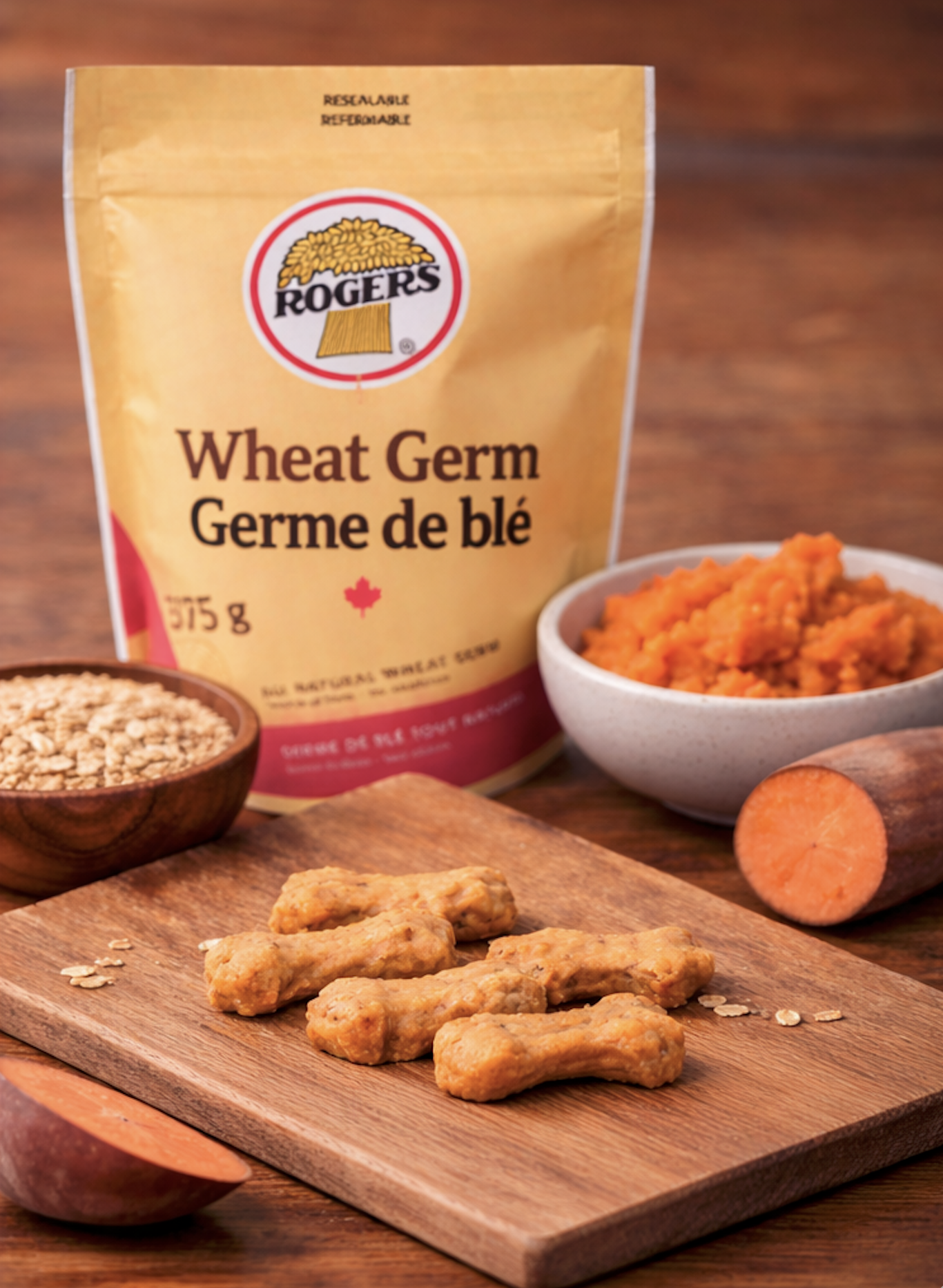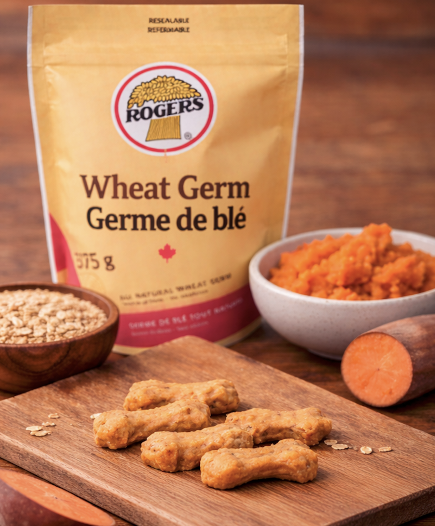 Hearty dog biscuits made with Rogers Foods Wheat Germ and sweet potato — packed with nutrients and naturally delicious.
